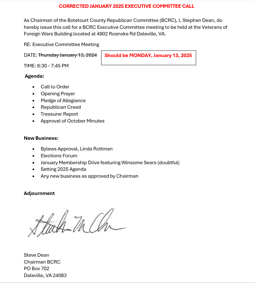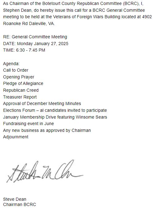 As Chairman of the Botetourt County Republican Committee (BCRC), I, Stephen Dean, do hereby issue this call for a BCRC committee meeting to be held at Veterans of Foreign Wars 4902 Roanoke Rd, Daleville, VA 24083, from 6:30-8:30 local time on August 12, 2024,